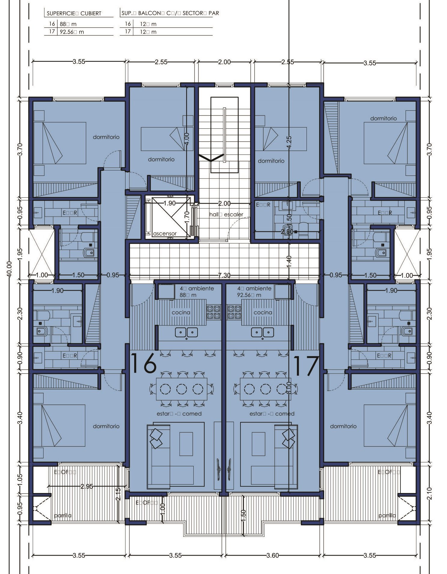 San Juan 2875 (6 pisos con cocheras) - San Juan 3056 (6 pisos con cocheras) - J.V. González 123 (7 pisos) – San Juan esq. Mensajerías (PB y 2 pisos).- Bruno I (6 pisos con cocheras) - Bruno II (7 pisos con cocheras) - Bruno III (6 pisos con cocheras)