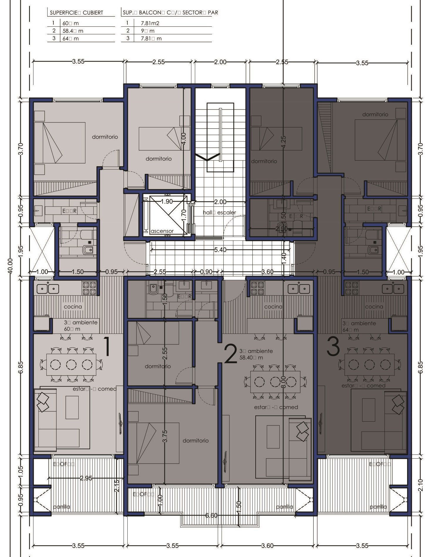 San Juan 2875 (6 pisos con cocheras) - San Juan 3056 (6 pisos con cocheras) - J.V. González 123 (7 pisos) – San Juan esq. Mensajerías (PB y 2 pisos).- Bruno I (6 pisos con cocheras) - Bruno II (7 pisos con cocheras) - Bruno III (6 pisos con cocheras)